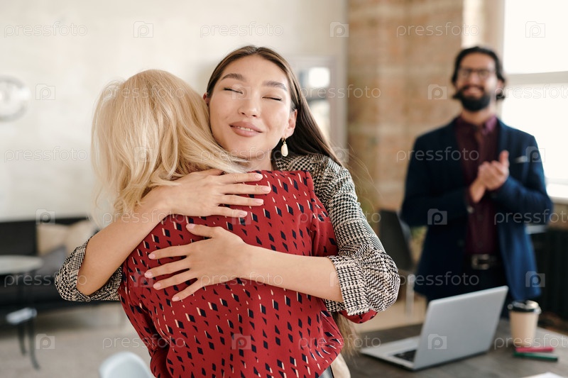Счастливая азиатская бизнесвумен поздравляет одного из коллег с отличной работой