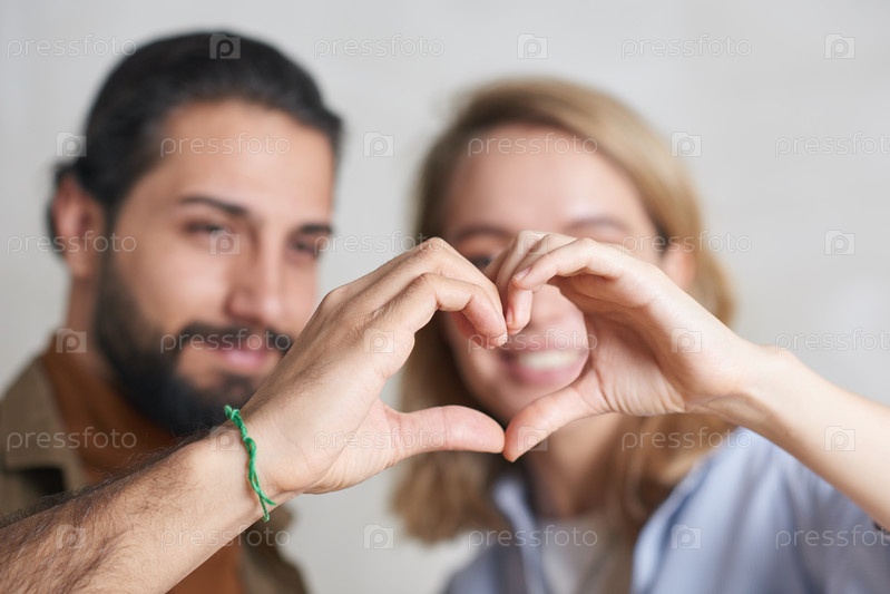 Близкий снимок красивого молодого человека и привлекательной блондинки, делающих жест руки сердца вместе