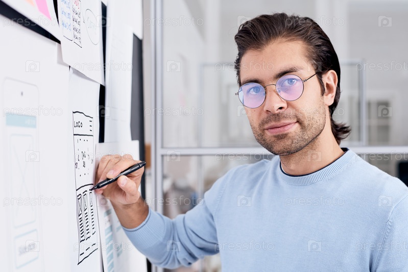 Красивый дизайнер пользовательского интерфейса рисует на доске планирования