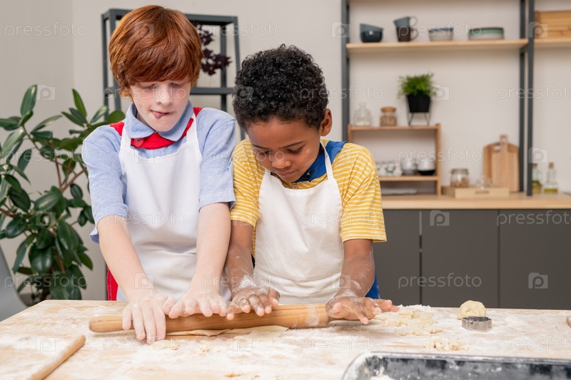Милый мальчик качает домашнее тесто на деревянном столе со своей мамой рядом