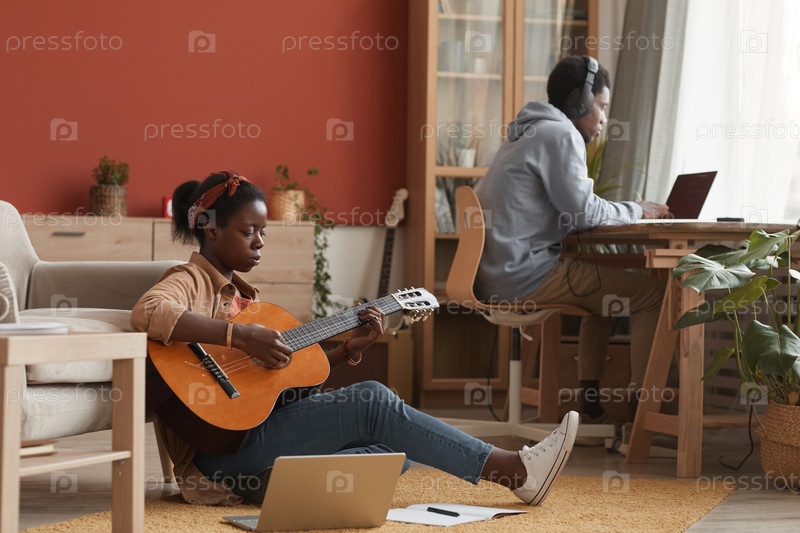 Афроамериканская женщина играет на гитаре, сидя на полу