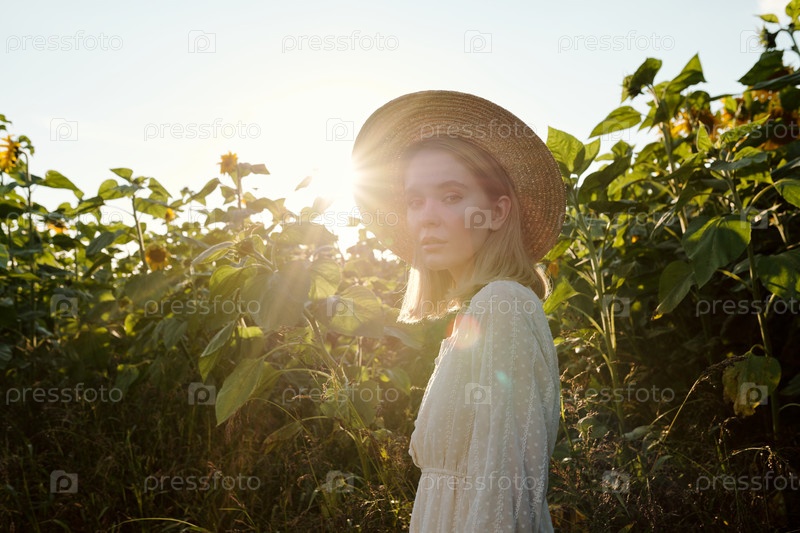 Красивая молодая женщина в шляпе и платье, стоящая напротив подсолнечника при восходе солнца