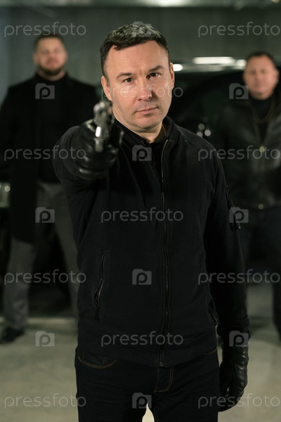 Террорист в черных джинсах, куртке и кожаных перчатках указывает на вас с пистолетом