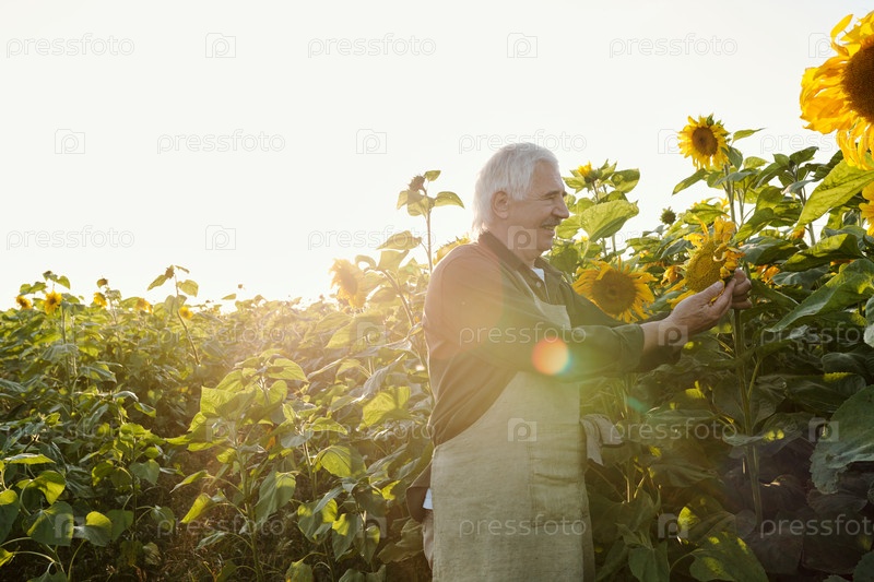 Счастливый зрелый фермер-мужчина в рабочей одежде смотрит на один из созревших больших подсолнечников