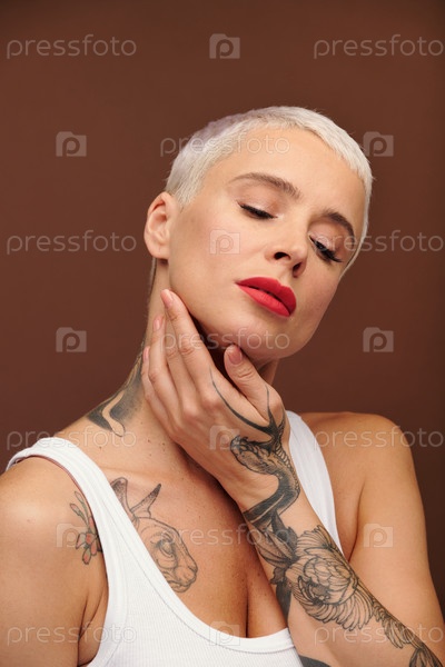 Зрелая блондинка с татуировками на руке, прикасающаяся к лицу рукой