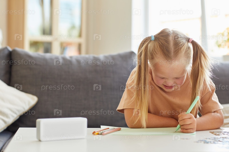 Девочка с синдромом Дауна, выполняющая домашнее задание