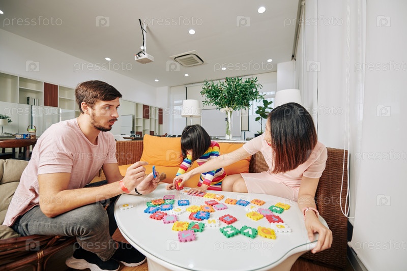 Семья, делающая алфавитную головоломку