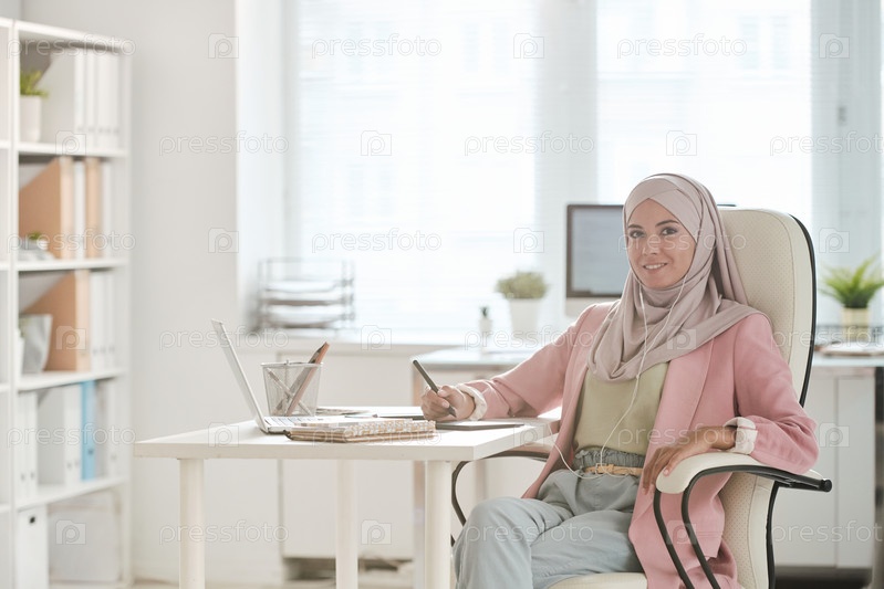 Молодая мусульманка в хиджабе и наушниках ретуширует изображения или рисует эскиз