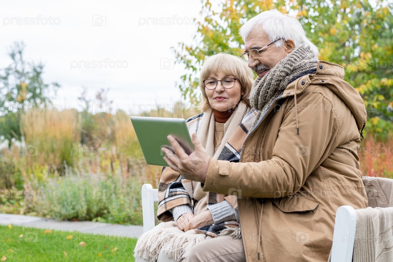 Пожилые муж и жена с цифровым планшетом смотрят онлайн-фильм на скамейке