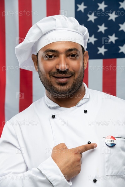 Улыбающийся мужской шеф-повар ресторана в форме, указывающий на значок голосования на груди