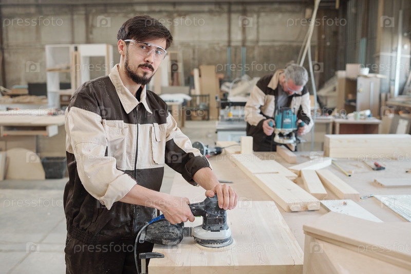 Молодой фабричный работник использует мельницу, чтобы сделать поверхность заготовки гладкой