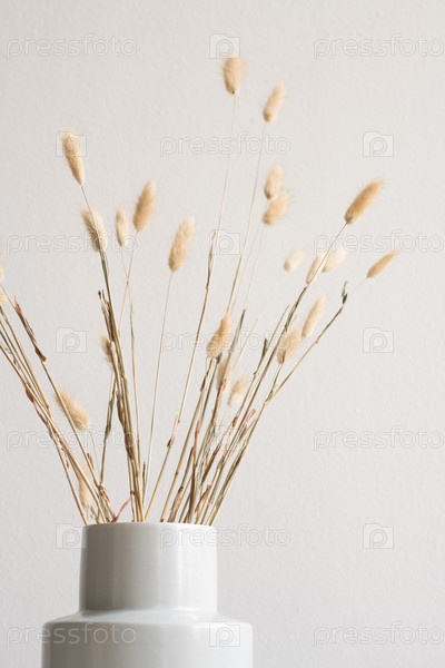 Куча сушеных диких цветов или шипов внутри белой керамической вазы на стене