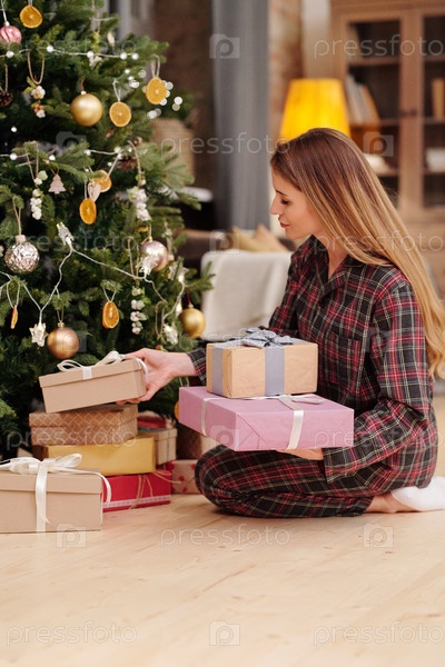 Молодая женщина готовит рождественские подарки для своей семьи, кладя их под дерево