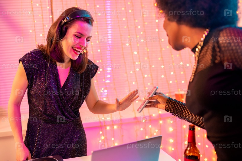Счастливая юная смеющаяся женщина в гламурном платье смотрит на экран смартфона