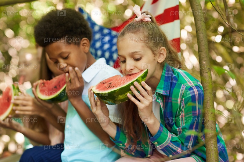 Дети, которые едят арбузы на свежем воздухе