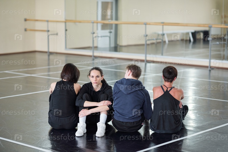 Молодая серьезная женщина смотрит на камеру, сидя среди трех танцоров