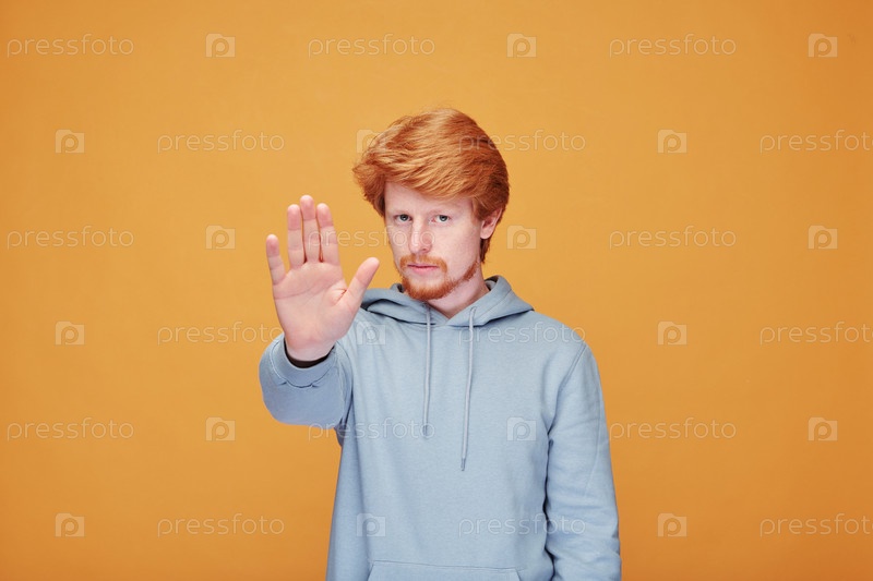 Серьезный молодой человек показывает жест остановки и просит вас держаться на расстоянии