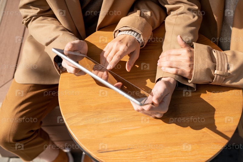 Руки молодого современного мужчины и женщины в бежевом траншкоте с помощью планшета