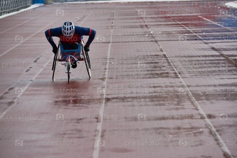 Инвалидный спортсмен-мужчина в гоночном кресле готовится к важному соревнованию