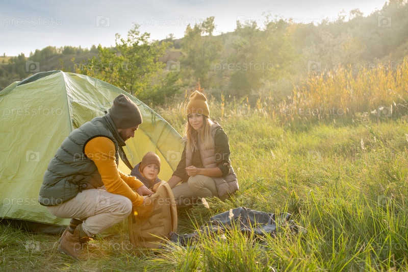 Молодой человек выносит еду из рюкзака, когда приседает в палатке со своей семьей