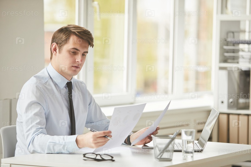 Молодой бизнесмен читает документы за рабочим столом