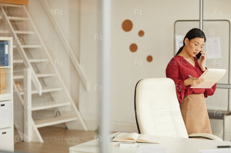 Успешная азиатская бизнесвумен разговаривает по телефону