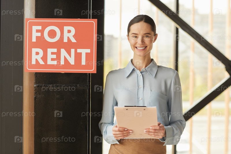 Женщина-агент по прокату Standing by For Rent Sign