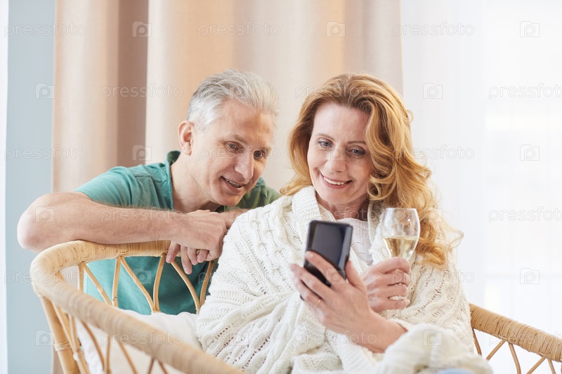 Портрет элегантной зрелой пары, смотрящей на экран смартфона дома
