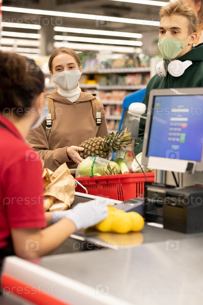 Молодая кассирка сканирует бутылку оливкового масла, глядя на зрелую пару