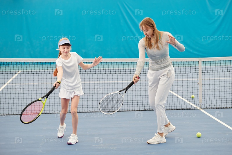 Молодая женская теннисная тренерка в спортивной одежде показывает девочке-подростку, как пользоваться ракетой