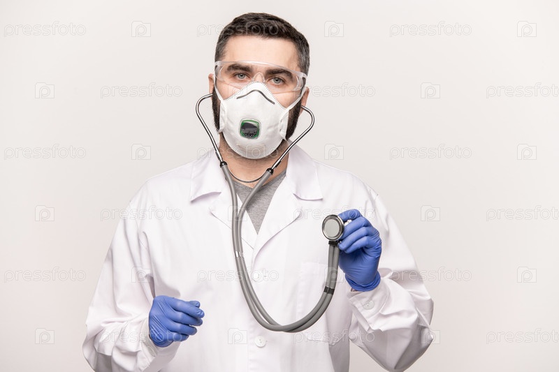 Молодой клиницист-мужчина в форме, держащий стетоскоп во время медицинского осмотра