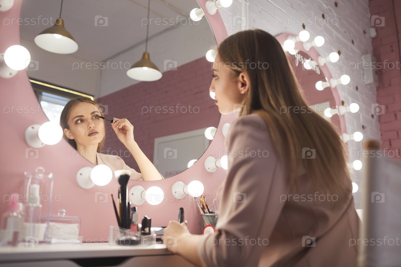 Молодая женщина смотрит в зеркало и наносит макияж у раздевалки