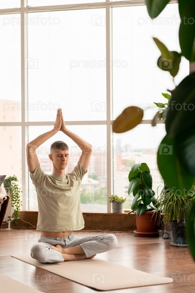 Молодой человек сидит на подстилке и держит руки вместе над головой