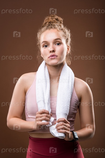 Молодая спортсменка с белым мягким полотенцем на шее отдыхает после тренировки