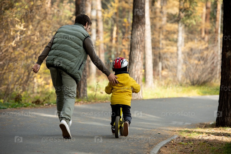 Задний вид молодого отца, бегущего за своим маленьким сыном на велосипеде с балансом