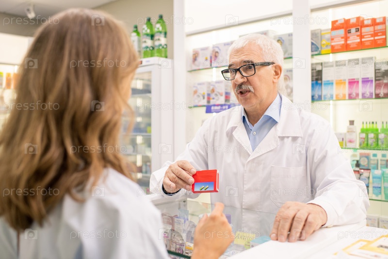 Старший профессиональный фармацевт показывает пакет нового эффективного лекарства
