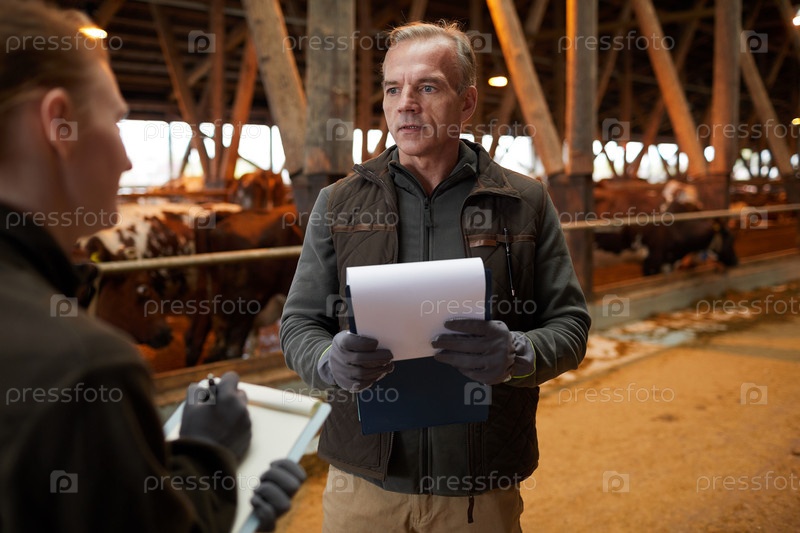 Управляющий фермой обучает женщину-работницу