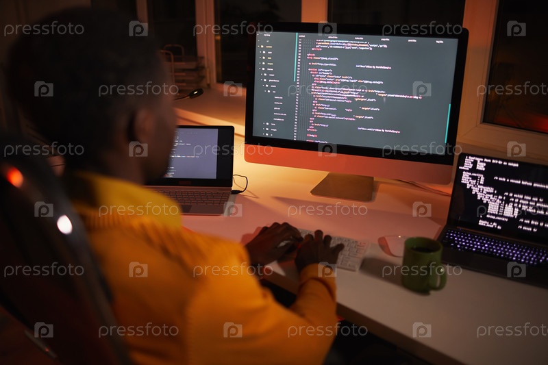 Афроамериканский ИТ-разработчик, пишущий код