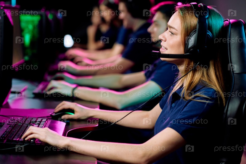 Девушка играет в компьютерные игры в электронном спортивном клубе