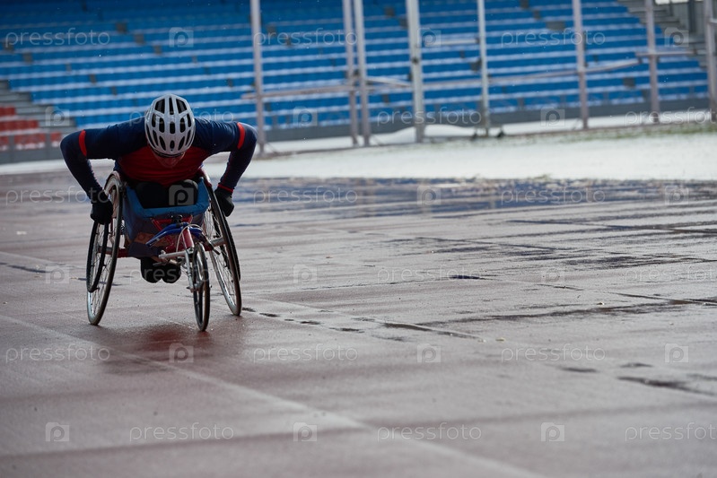 Определенный парализованный спортсмен, гоняющийся в ручном велосипеде на открытом стадионе