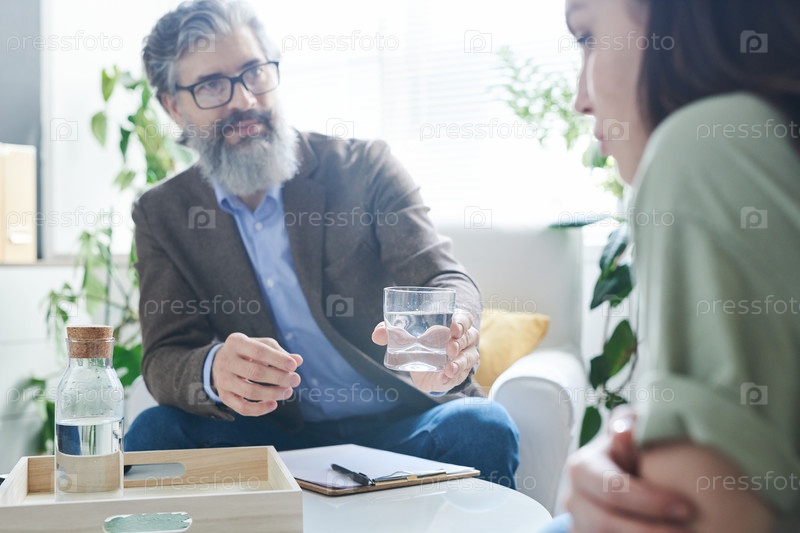 Старший консультант с бородой передает бокал воды своей молодой пациентке