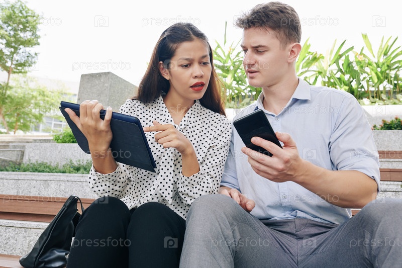 Деловая женщина и бизнесмен сравнивают электронные письма