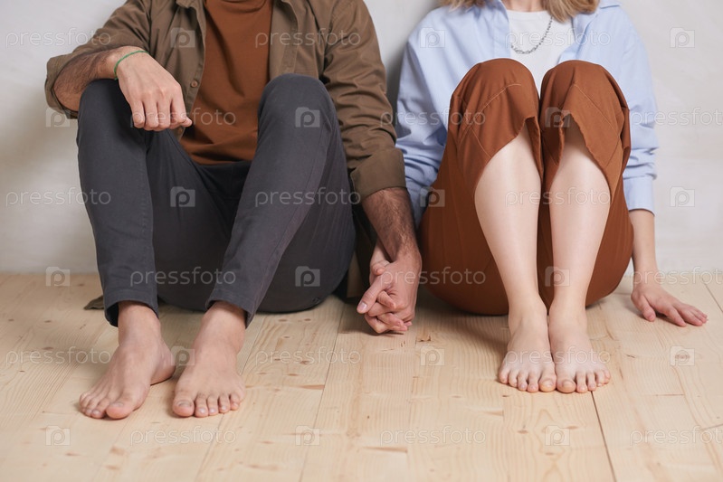 Красивая неузнаваемая пара в обычной одежде, расслабленно сидящая на полу и держась за руки, копирует пространство