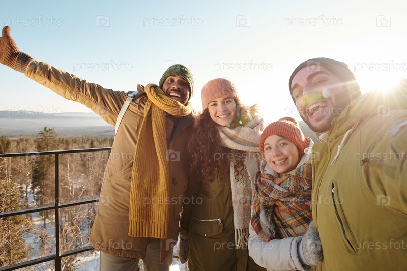 Взволнованные межкультурные друзья в зимней одежде делают селфи на солнце