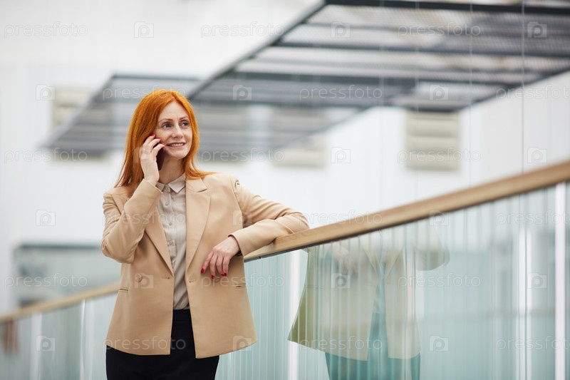 Зрелая бизнесвумен разговаривает по телефону на офисном балконе
