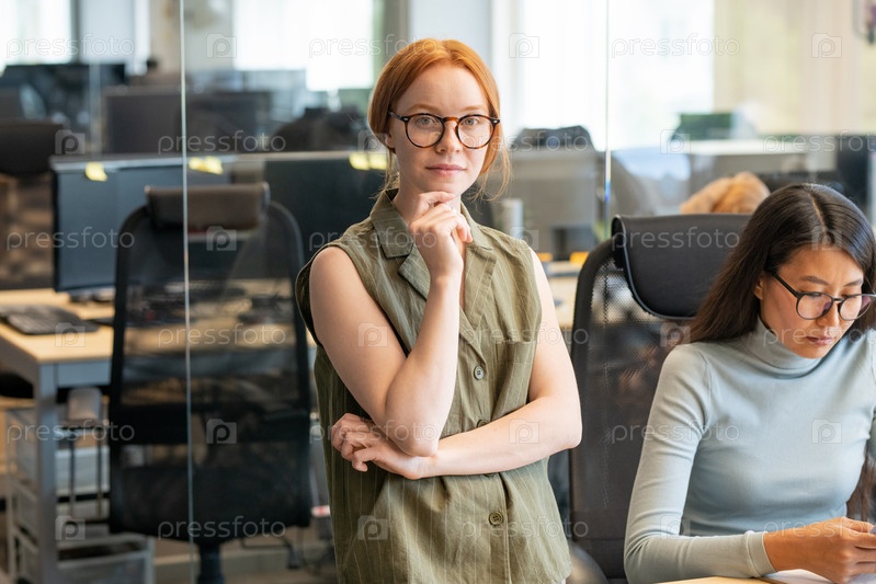 Молодая серьезная бизнес-женщина в очках стоит за столом рядом со своей коллегой