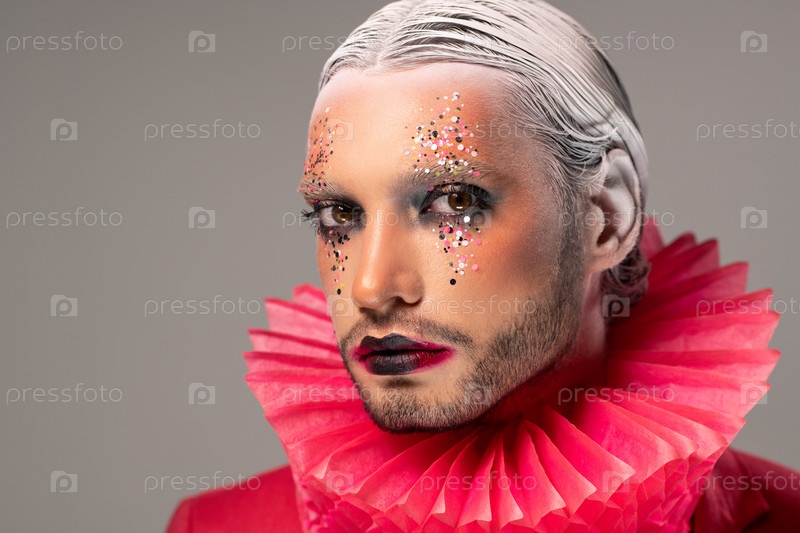 Молодой актер со сценическим макияжем, белыми волосами и красным ошейником шута вокруг шеи