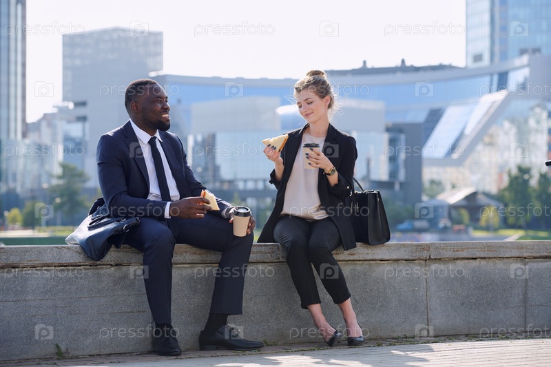 Два счастливых молодых межкультурных бизнес-партнера в формальной одежде обедают
