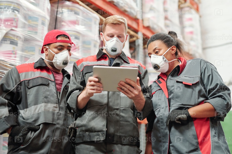 Группа складских рабочих в респираторах прокручивает ассортимент товаров