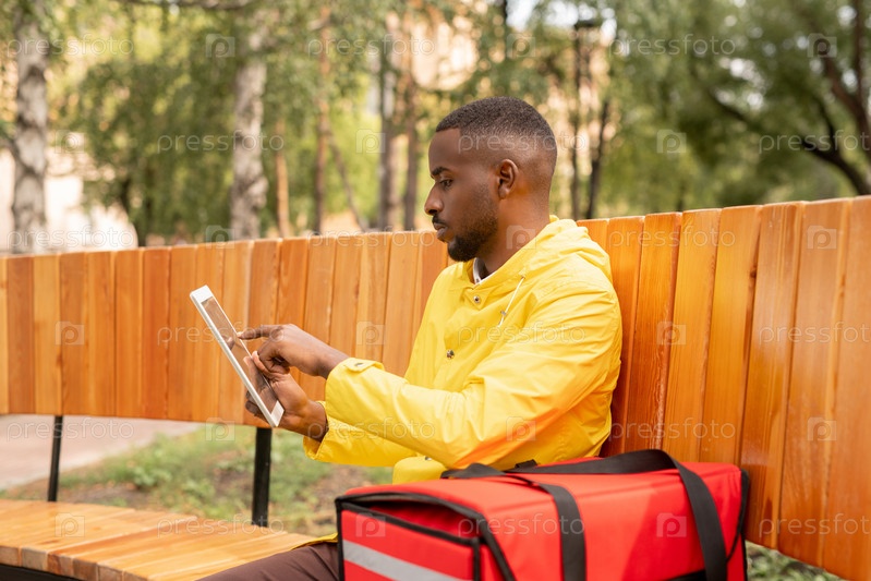 Молодой курьер африканской этнической принадлежности с заказами в большом красном рюкзаке, используя планшет